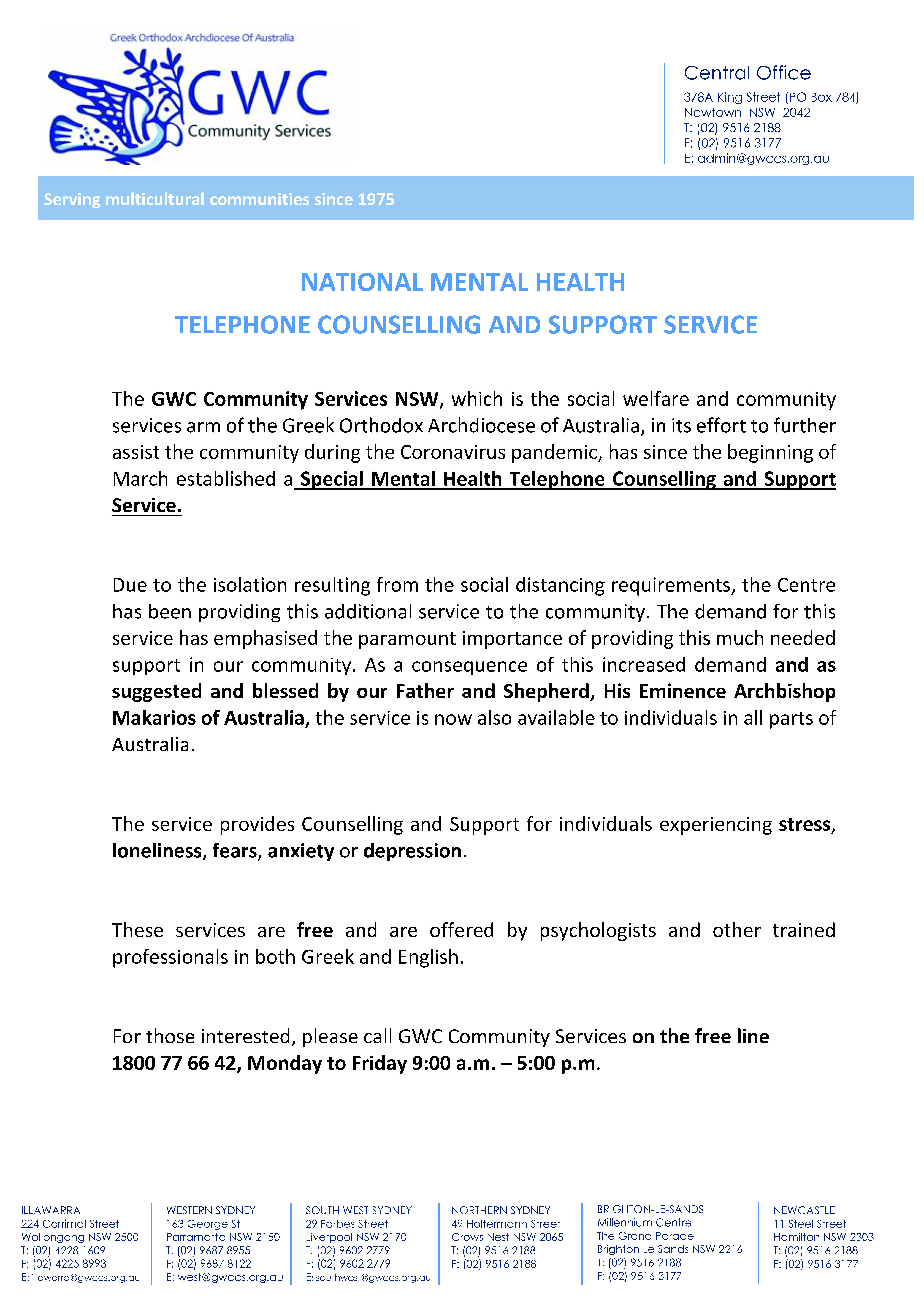 The GWC Community Services NSW established a Special Mental Health Telephone Counselling and Support Service.