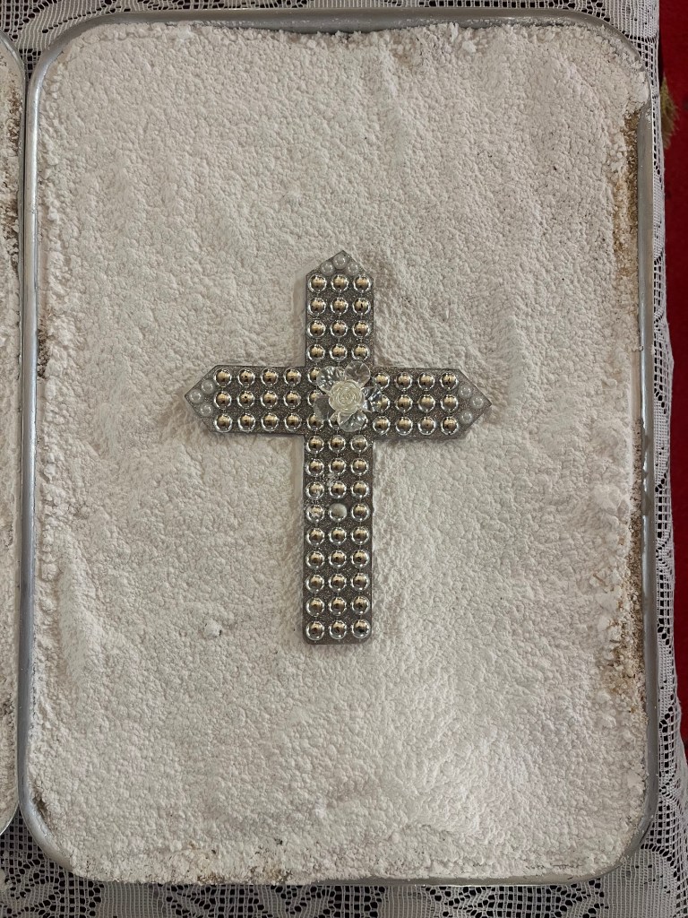 The Orthodox Church has a tradition of having a memorial service in memory of our deceased loves ones. During this service we commemorate the names of those passed and offer a plate of Kolyva (as shown). The Kolyva (boiled wheat) holds a significant symbolism which expresses our belief in everlasting life. Jesus Himself said that “…unless a grain of wheat falls into the earth and dies, it remains alone, but if it dies, it bears much fruit” (John 12:24). Just as new life rises from the buried kernel of wheat, so too does the Church believe that the one buried will rise one day to a new life in God. The wheat is then covered in sugar and sultanas to symbolise the bliss of eternal life in Heaven.